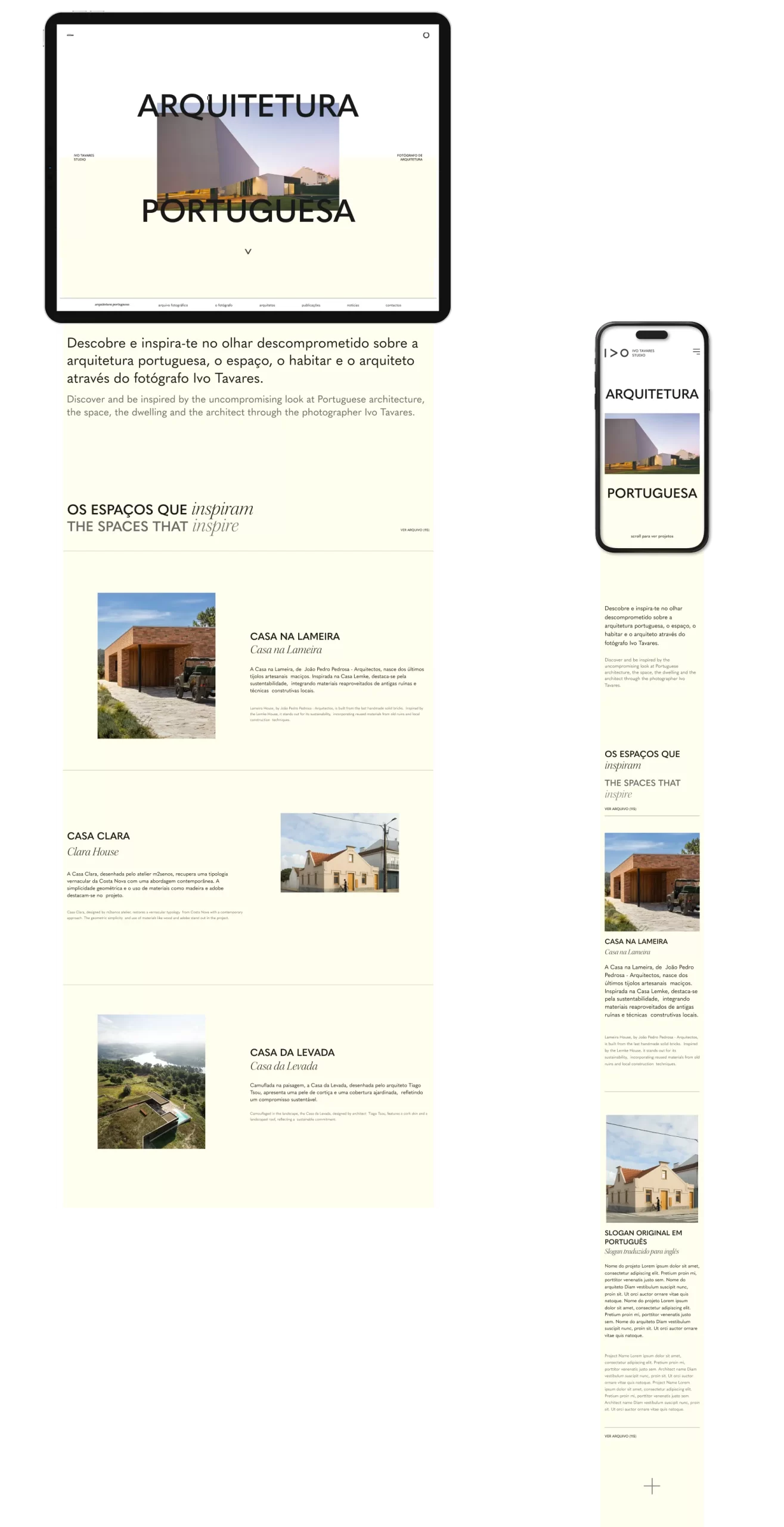 Os tons neutros criam uma base discreta, permitindo que as fotografias respirem e se destaquem com nitidez. Ao mesmo tempo, evocam calor e proximidade, estabelecendo uma ligação emocional subtil com o utilizador. Esta escolha reforça os valores da arquitetura — equilíbrio, funcionalidade e harmonia — traduzidos aqui numa experiência visual serena, acessível e sofisticada.